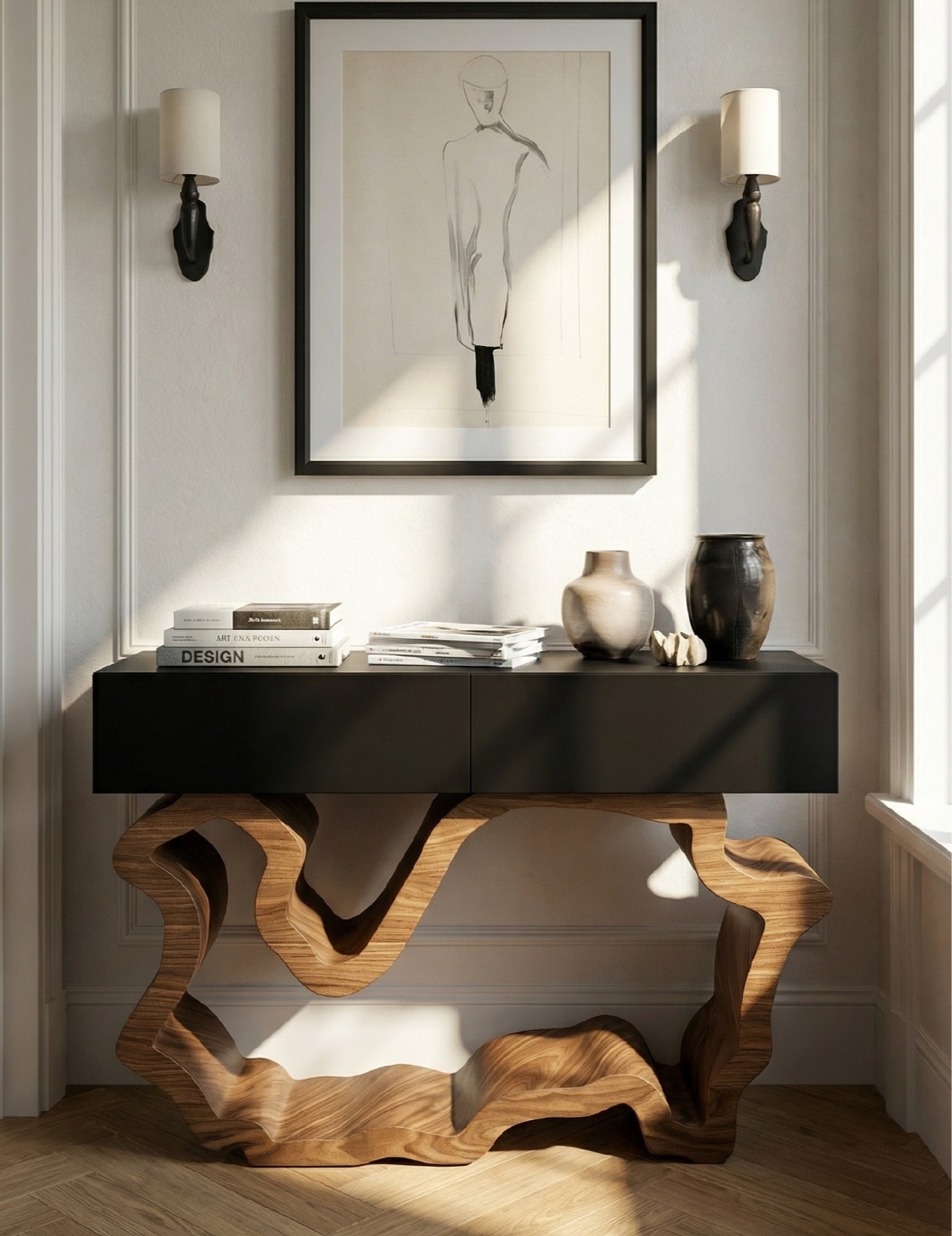 Размер 120 на 84 на 35 см, отделка низа шпон ореха, верх черный