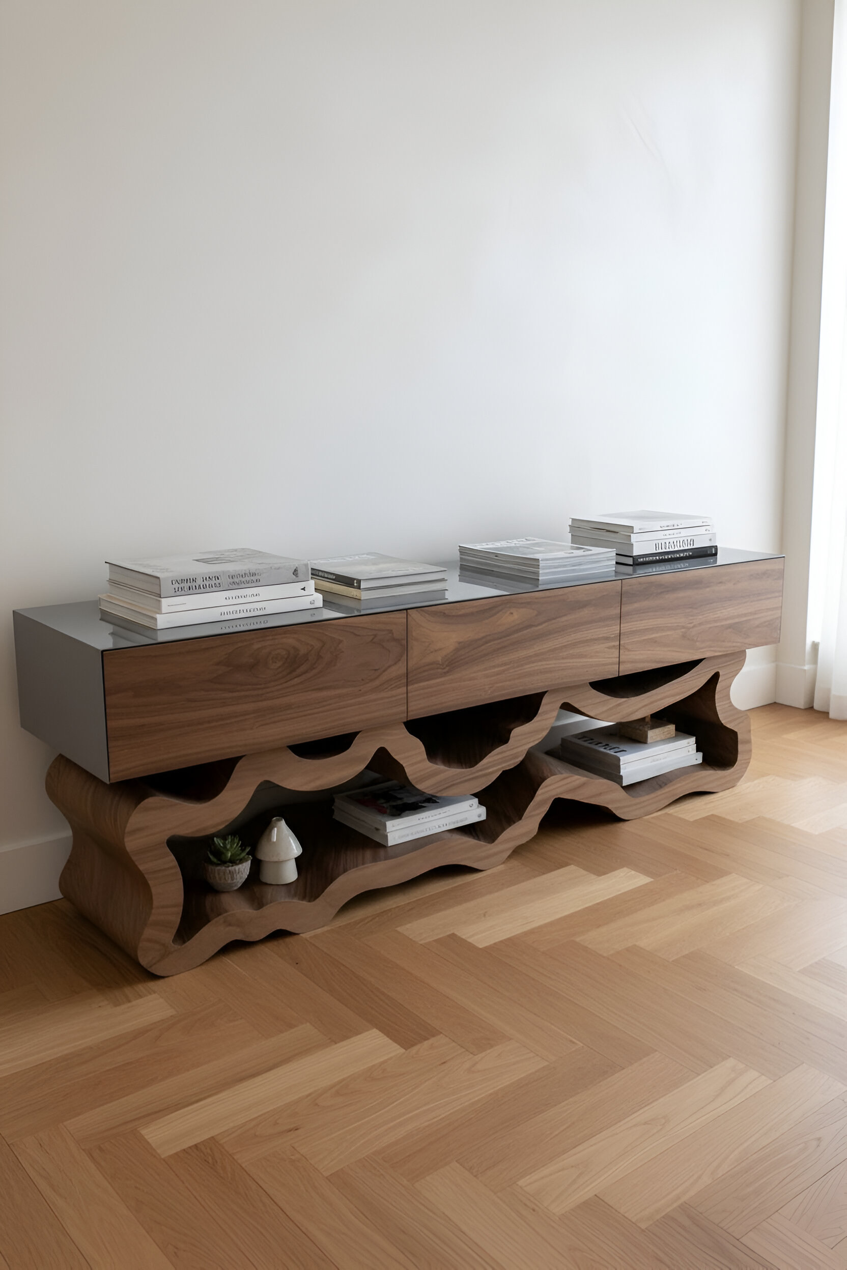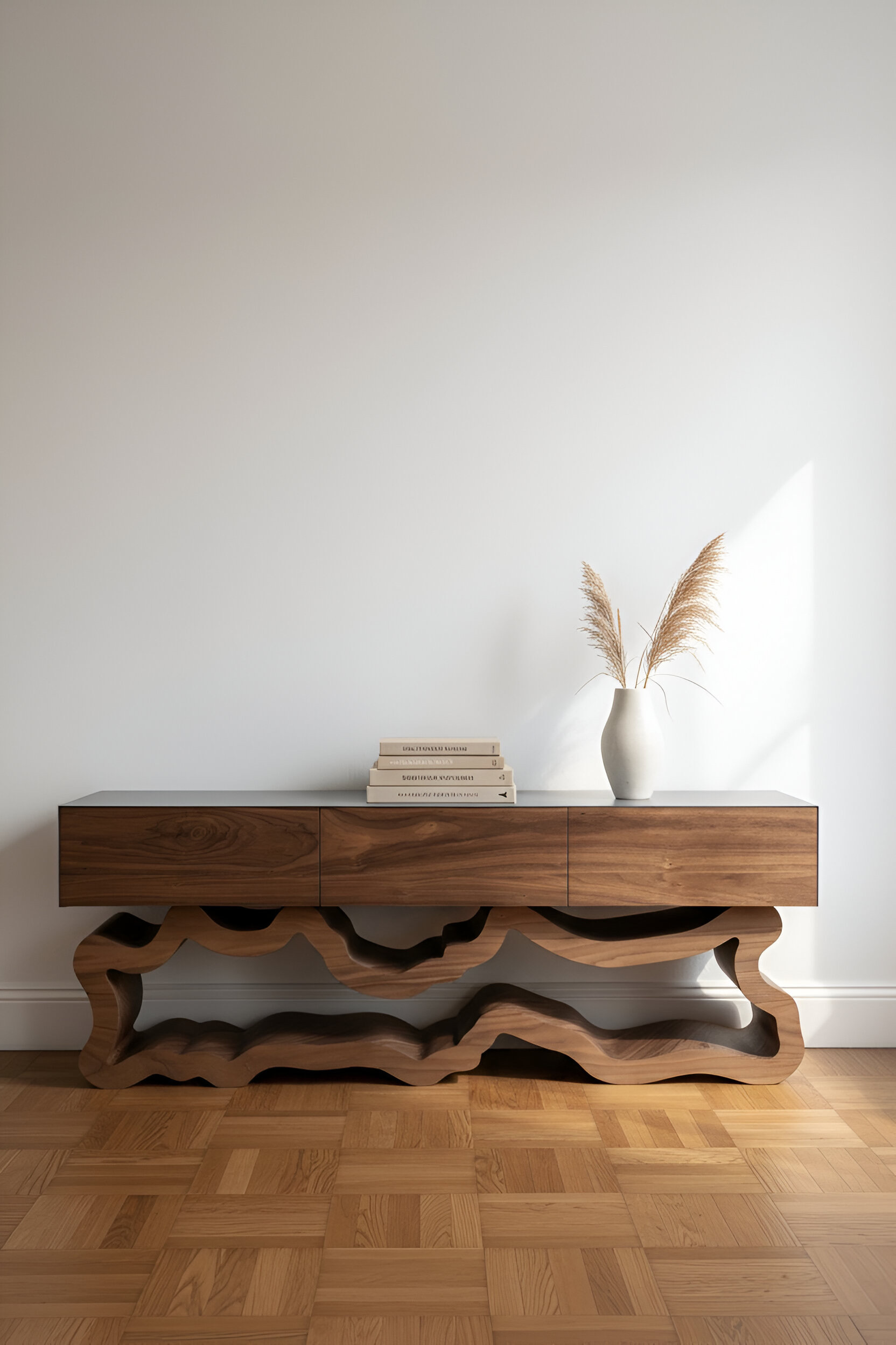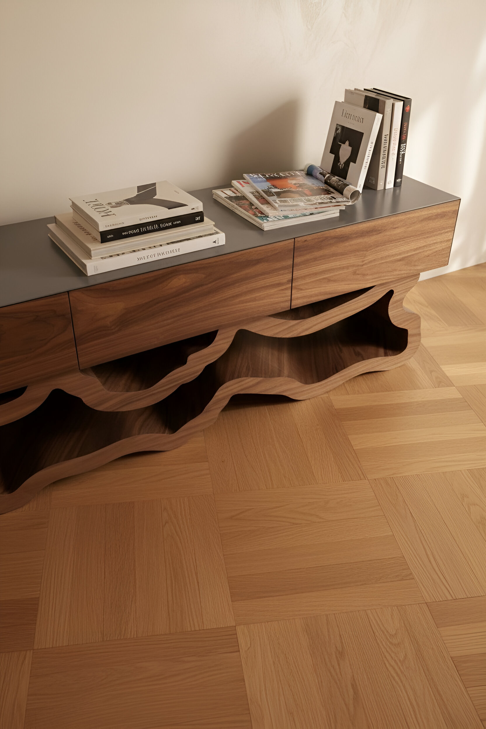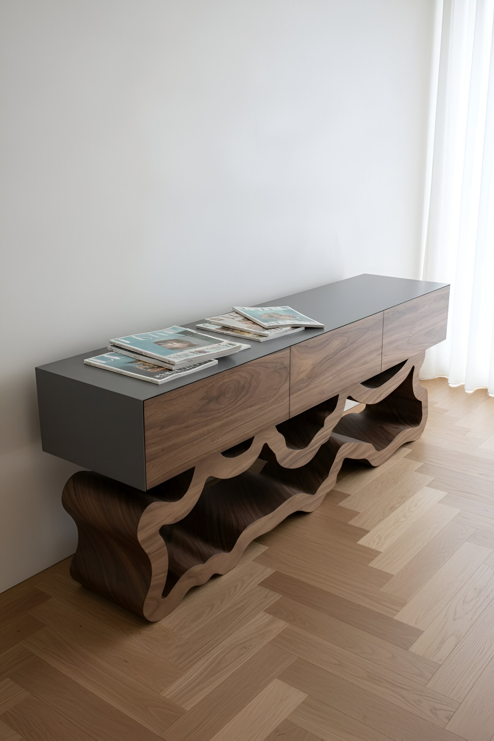 Тумба представляет собой цельную ножку из МДФ и шпона, шпон мы наносим по своей технологии работы со сложными формами, таким образом предмет получается прочным